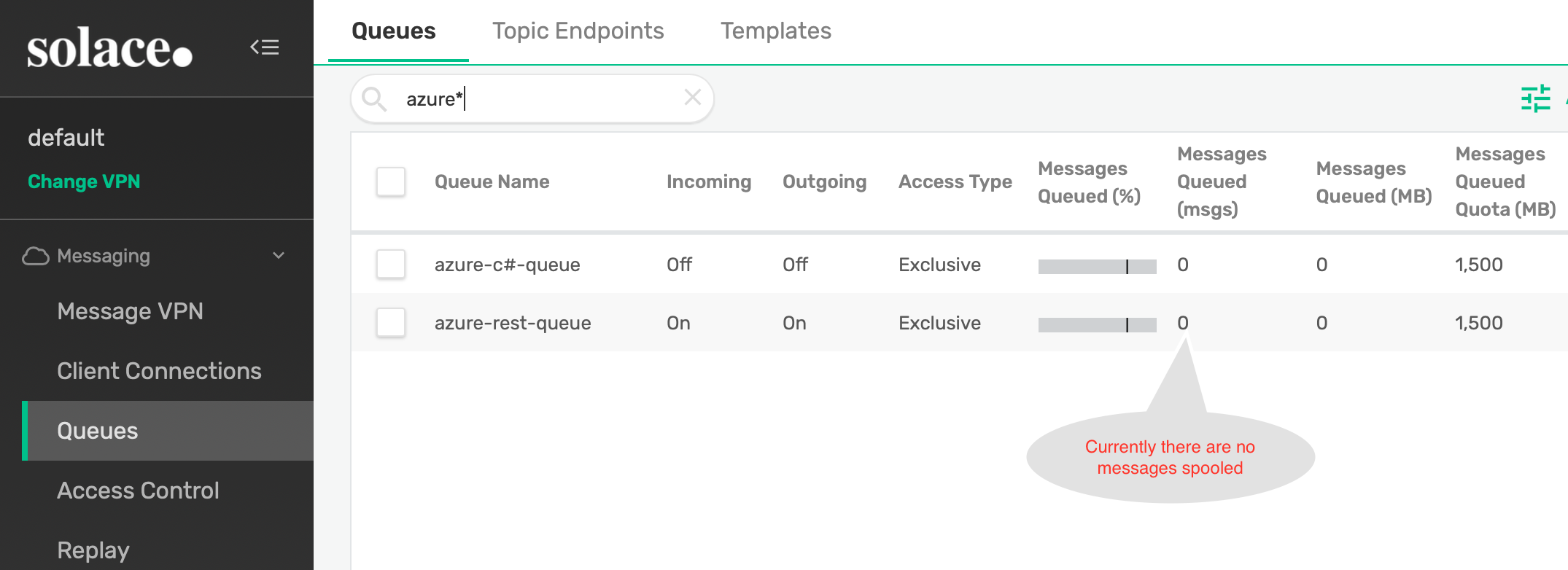 solace(configure/message-spool/message-vpn)# create queue azure-rest-queue