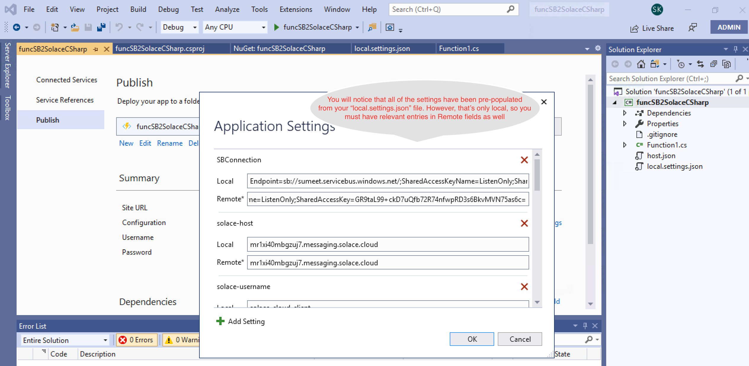 In the above screen you will do the following://Update the Service Bus end point connection string below "SBConnection": "Endpoint=....windows.net/;SharedAccessKeyName=ListenOnly;SharedAccessKey=xxxxxxxxxxxxxxxxxxxxxxx",