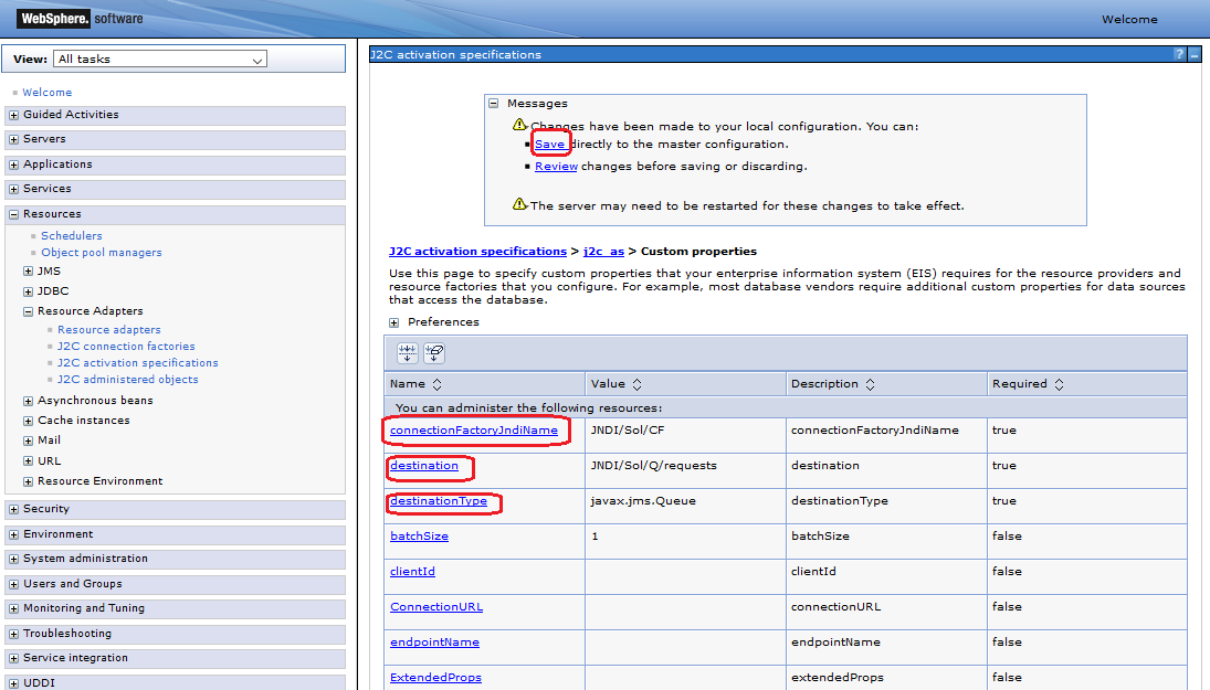 The following table summarizes the values used for the resource adapter"s bean properties if using an external JNDI store: